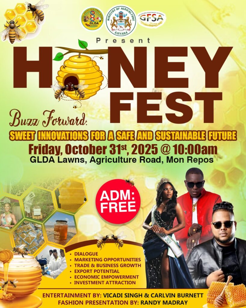 🍯 Something sweet is coming back… 👀 Get ready for Honey Fest 2025 celebrating Sweet Innovations for a Safe and Sustainable Future! 📅 Friday, October 31st, 2025 📍 GLDA Lawns, Agriculture Road, Mon Repos 🎟 FREE Admission Stay tuned… this one’s going to buzz! 🐝💛 #HoneyFest2025 #SweetInnovation #SustainableFuture #GuyanaEvents #GLDA #BeTheBuzz